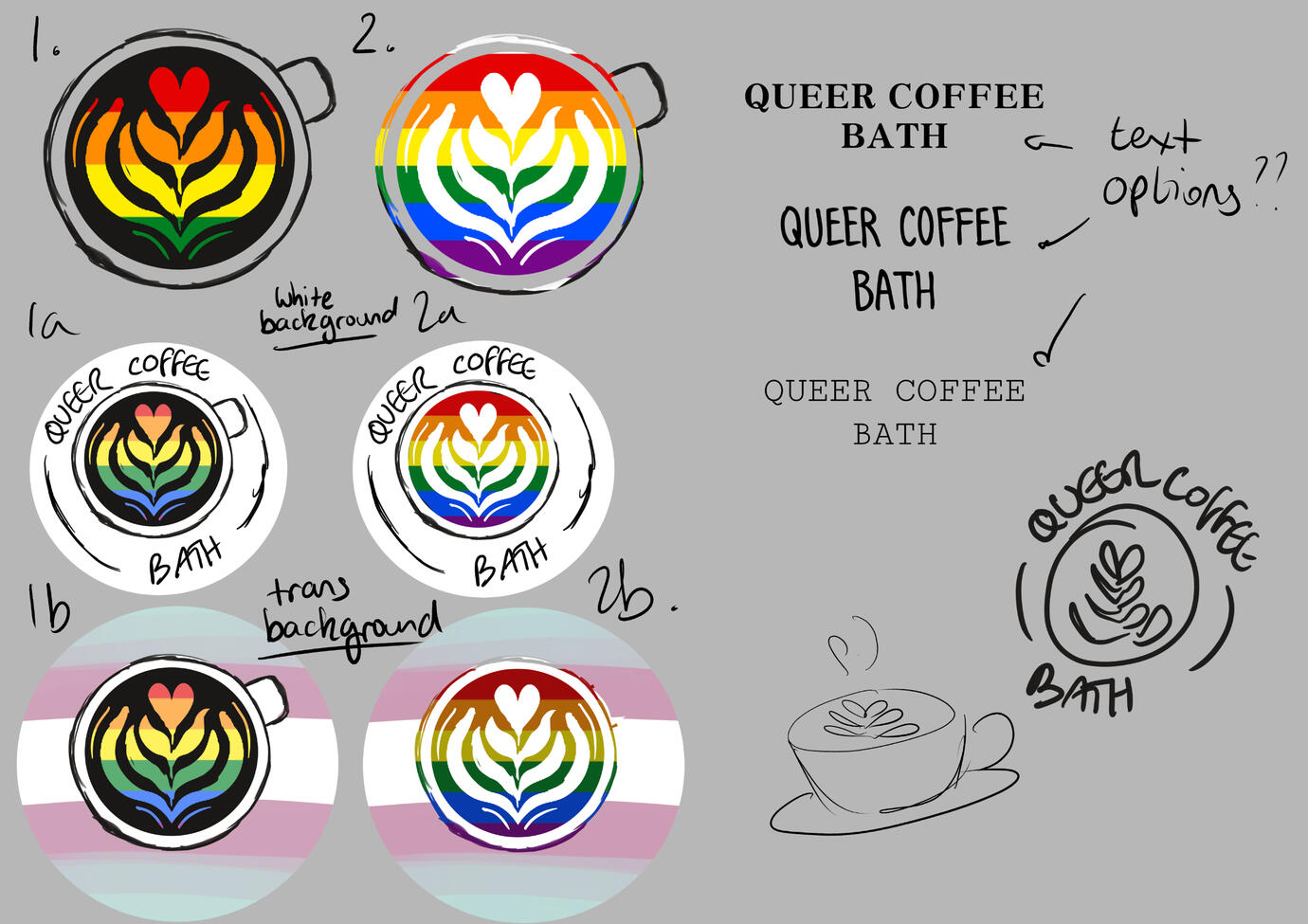 A simple logo design for a local queer coffee meetup group. The logo had to be small enough to be able to be added to digital and print posters, and also serve as an profile picture for social media, while clearly communicating the group's branding - a welcoming, inclusive, and vibrantly queer space.Created using a combination of Clip Studio Paint, Photoshop and Adobe IllustratorQueer Coffee Bath Instagram