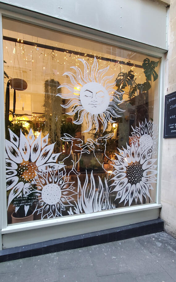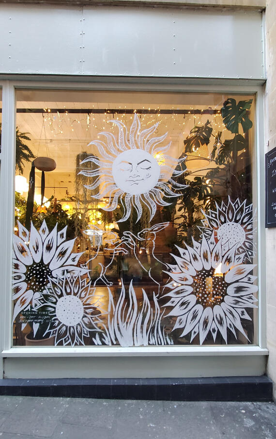 I was given the amazing opportunity to design and paint the summer window display for the local independant plant shop - Botanica Studios in Union Passage, Bath.Taking inspiration from the warm vibe of the shop, and magical mood of the previous window displays, I added in a tarot-inspired sun front and centre in the design.
