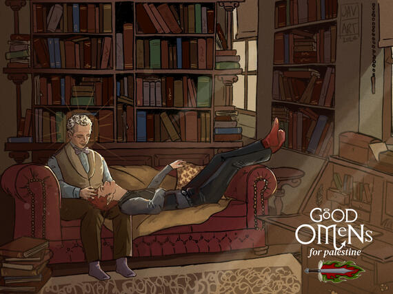 A collaborative, entirely not-for-profit, project organised by the fan community of Good Omens.This 20 page digital zine contained a mixture of fanart and writing from talented creations and, in it's limited run, raised over $300 USD for the United Nations Relief and Works Agency for Palestine Refugees (UNRWA).(not affiliated with Amazon Prime or Neil Gaiman) GO Zine for Palestine Tumblr